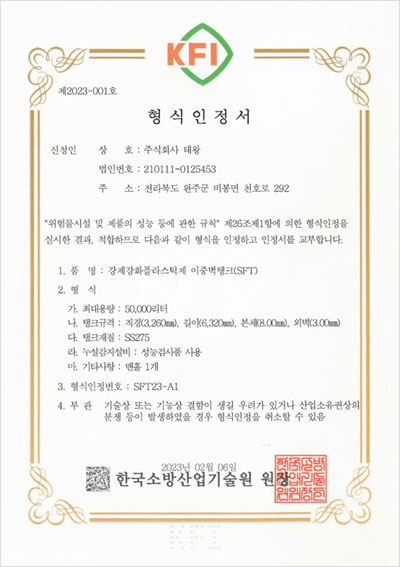 형식인정서 제2023-001호 페이지 정보 작성자 최고관리자 댓글 0건 조회 48회 작성일 24-03-19 19:50 목록 본문 형식인정서 제2023-001호 강제강화플라스틱제 이중벽탱크(SFT) 이전글형식변경인정서 제2023-002호 24.03.19 다음글특허증 제10-1729218호 24.03.19
